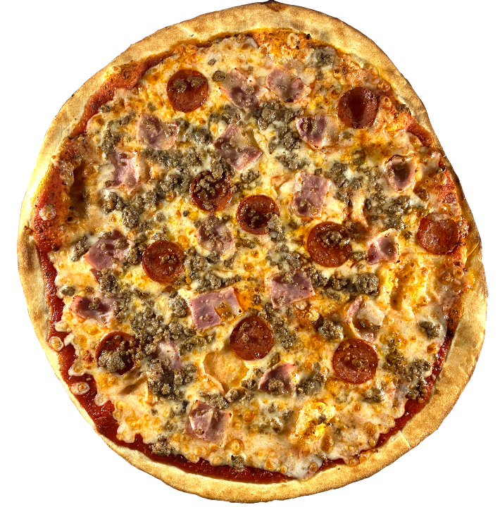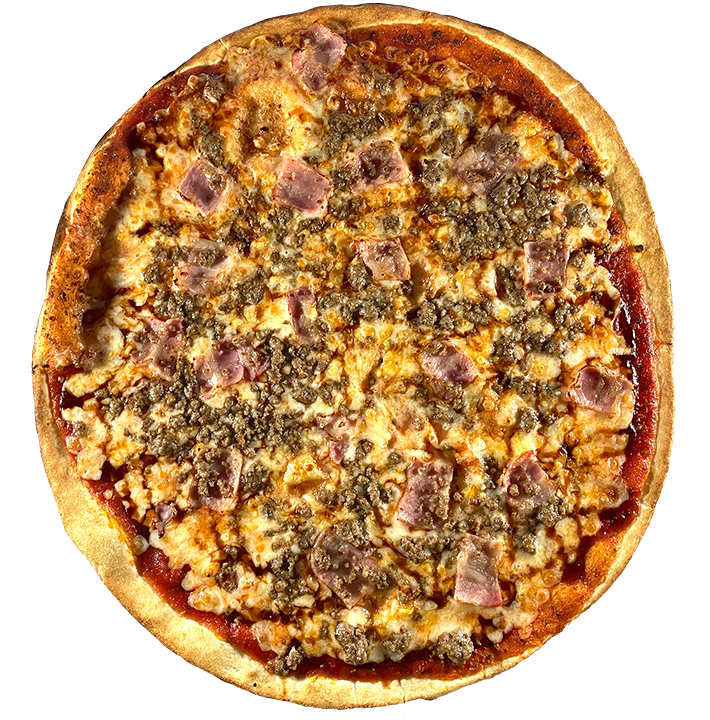 Ingr.: Tomate, Mozzarella pura, Bacon, Pepperoni, Ternera