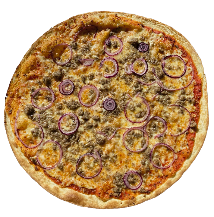 Pizza sencilla pero de sabor intenso, con ternera y cebolla natural morada.