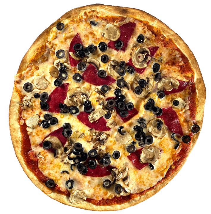 Ingr.: Tomate, Mozzarella pura, Salami, Champiñon, Aceitunas negras.