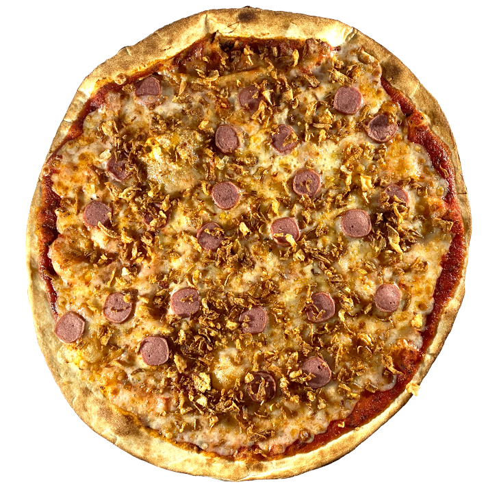 Pizza de salchicha troceada acompañada con cebolla crujiente frita colocada despues de hornear.