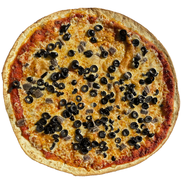 Ingr.: Tomate, Mozzarella pura, Anchoas, Aceitunas negras.
