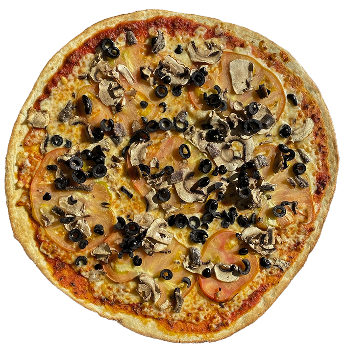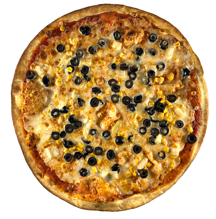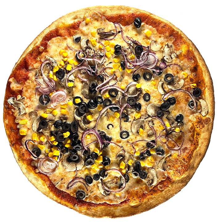 Ingr.: Tomate, Mozzarella pura, Champiñon, Cebolla, Maíz, Aceitunas negras.
