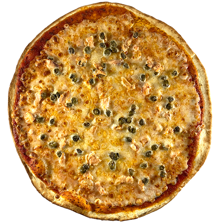 Ríquisima pizza de salmón ahumado troceado con toques de alcaparras.