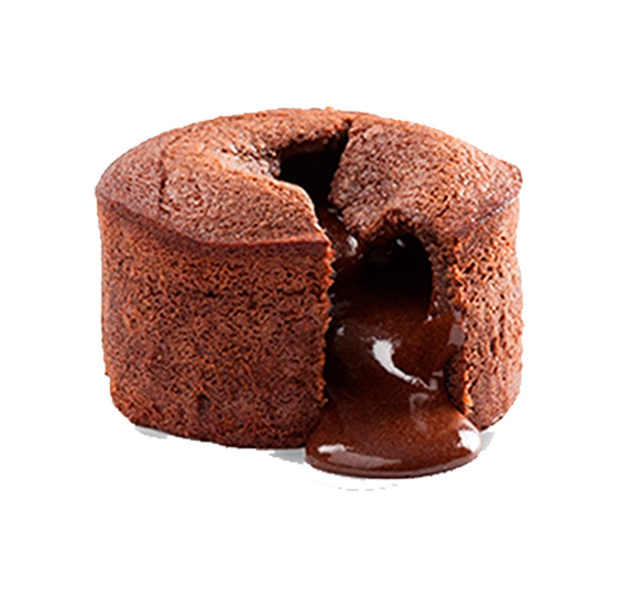 Coulant artesanal de chocolate, relleno de chocolate fundido y decorado con sirope y azúcar glass.