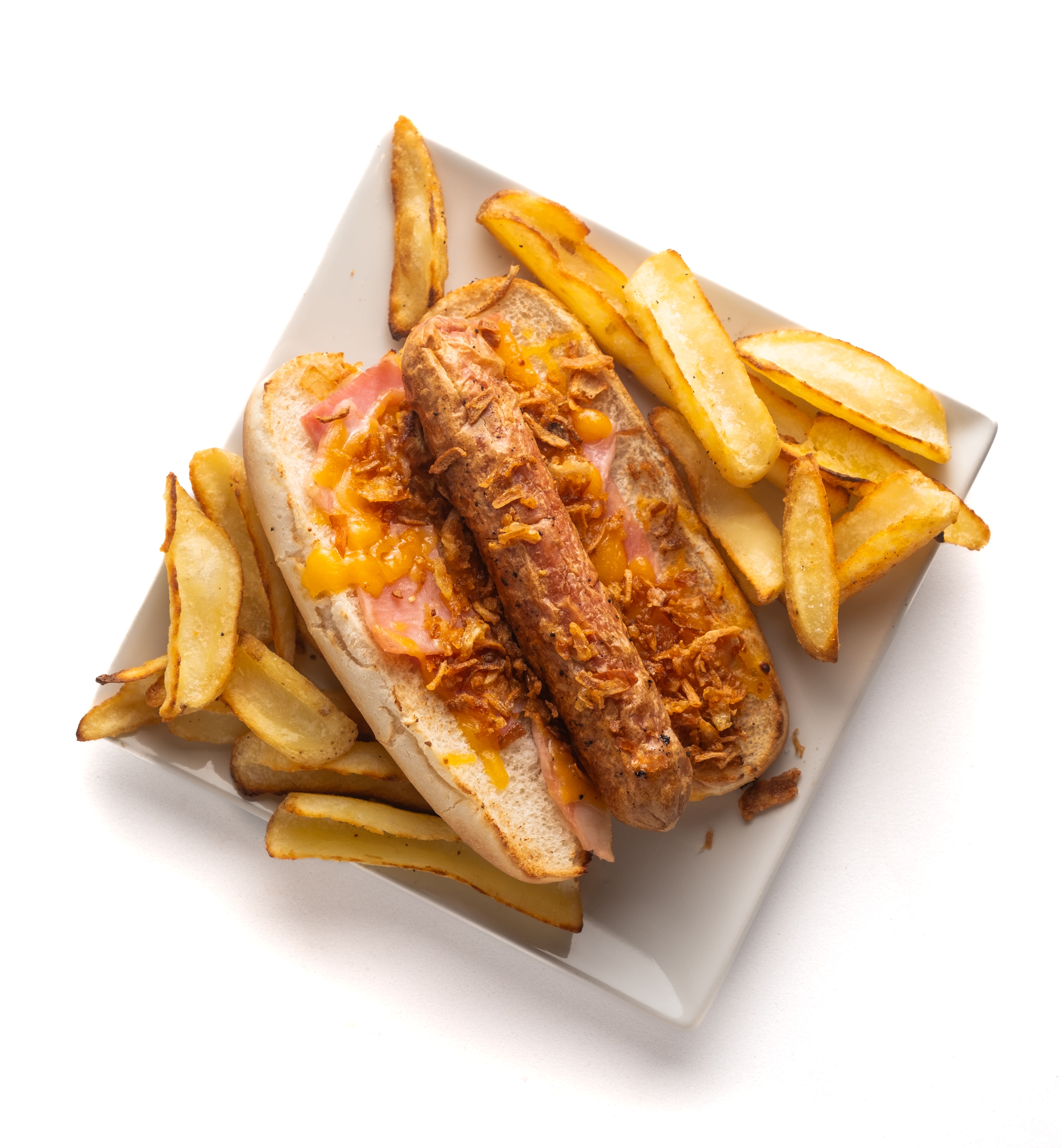Ingr.: Tomate, Mozzarella pura, Frankfurt, Cebolla crujiente