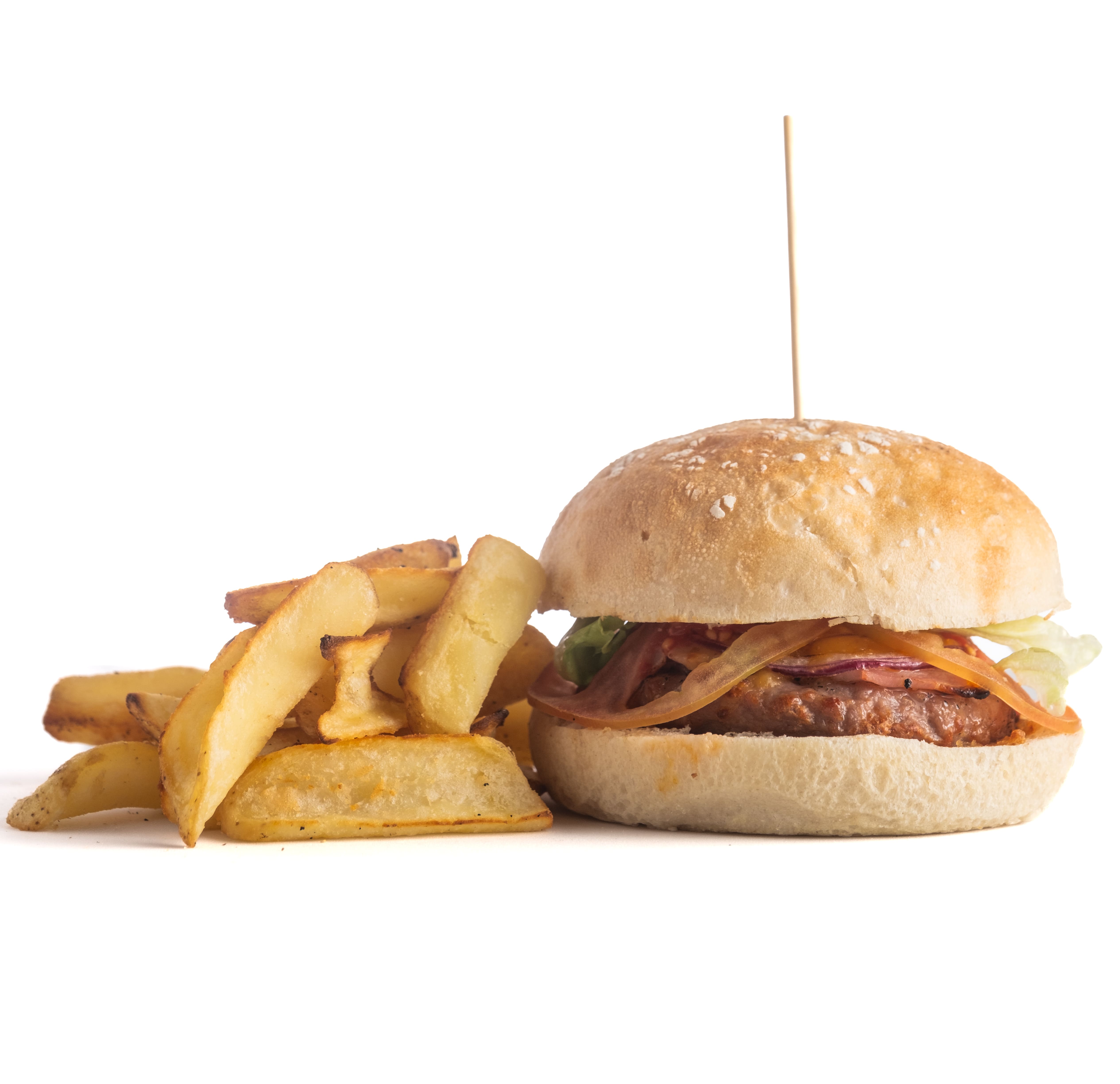 Pan de cristal horneado con carne de ternera o pollo, acompañada de queso cheddar, bacon, rodaja de tomate natural, cebolla morada, cebolla frita con ración de patatas.